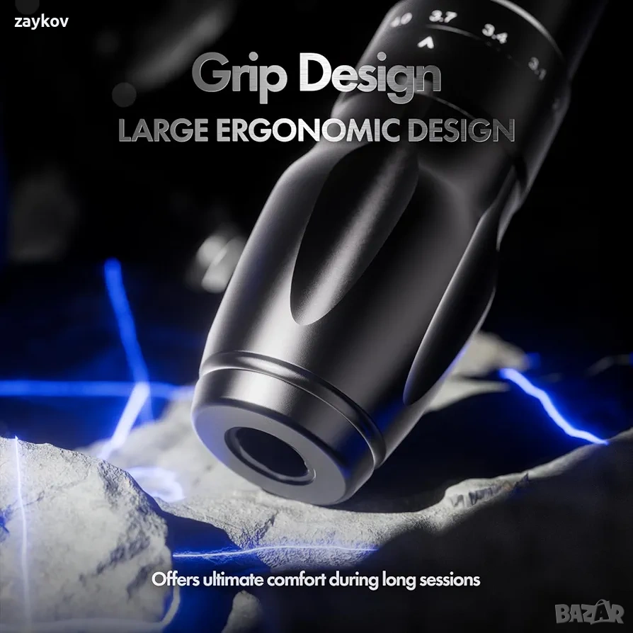 Дизайн на писалка за татуировки с ергономична дръжка: Тази безжична машина за татуировки е изработена от висококачествена алуминиева сплав от авиационен клас, която е едновременно лека и стабилна - идеална за дългосрочна професионална употреба. Ергономично проектираната дръжка с фини канали осигурява допълнително сцепление и удобно усещане в ръката. Размерът на дръжката се адаптира перфектно към формата на ръката, което гарантира комфортна работа дори при по-дълги сесии.