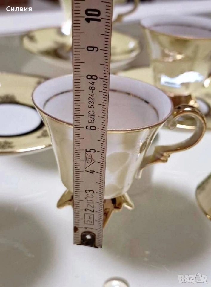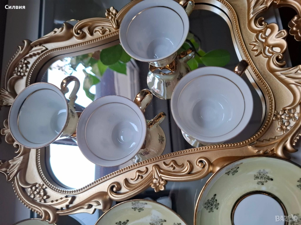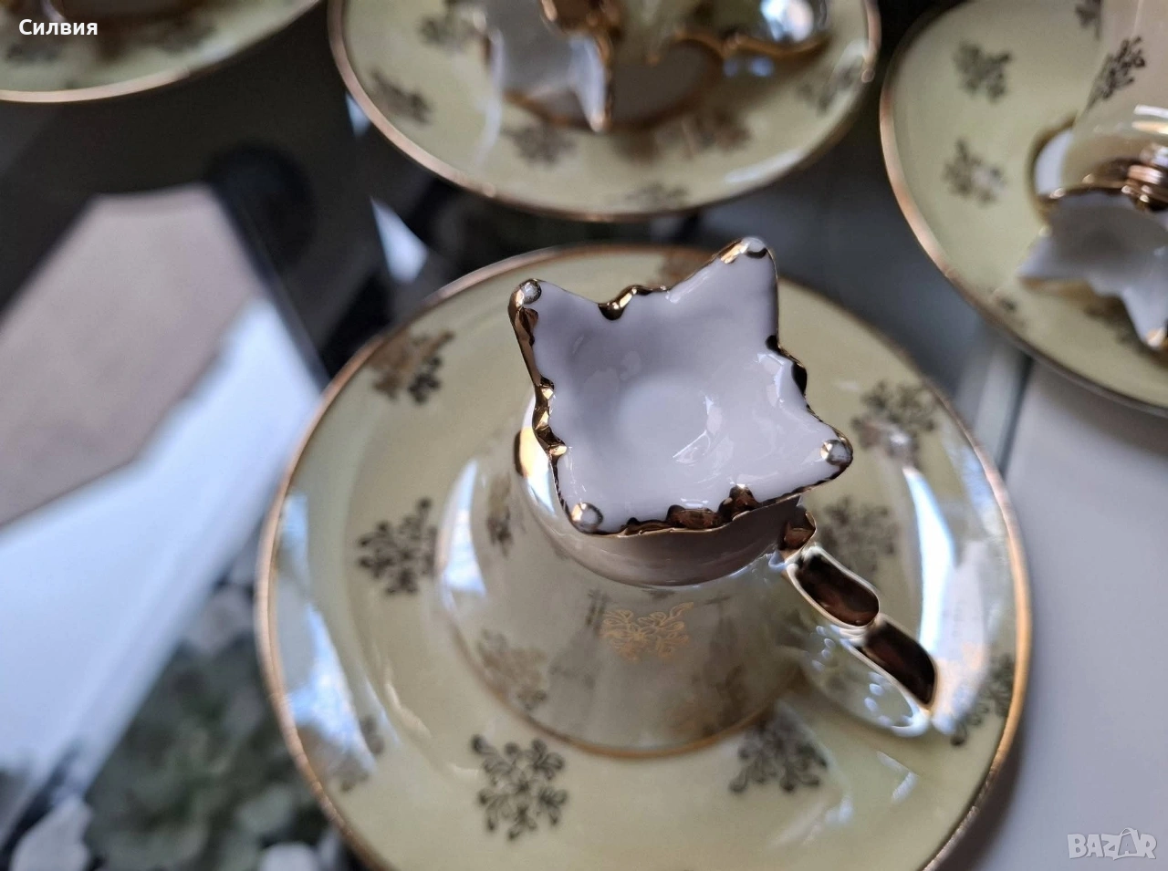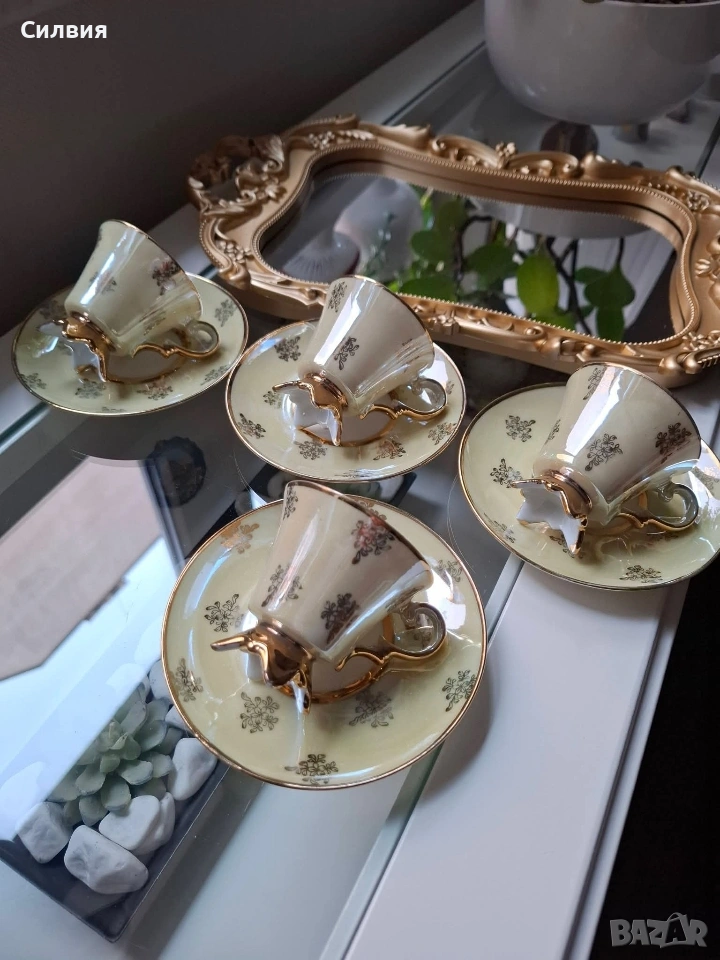 Ретро- Комплект: Демитас Чашки със Седефен Блясък Потопете се в очарованието на отминалите времена с този елегантен комплект малки чашки за кафе (демитас) с чинийки. Идеални за сервиране на силно еспресо или турско кафе, те превръщат всеки кафе ритуал в кралско удоволствие. ✨ Неповторим Седефен Финиш и Златен Акцент Това, което прави този комплект наистина забележителен, е неговият нежен, перленожълт емайл. Повърхността на порцелана е покрита с фин, ирисцентен блясък, който прелива в меки, седефени тонове – сякаш всяка чашка е обляна в лунна светлина. Този перлен ефект придава дълбочина и изисканост, които просто не се срещат в съвременното производство. Дизайн: Класически демитас форма с висока, елегантна основа (краче) в златист цвят. Дръжките също са със златен кант, допълващи луксозния вид. Всяка чашка и чинийка е украсена с деликатен, златист флорален мотив. Златото е акцентирано и по ръба на чашките и чинийките, създавайки завършен и богат вид. 4️⃣ двойни сета. Размери: Диаметър на чинийката: 11,5 см. Височина на чашката: 6 см. Диаметър- 6см. Вместимост 60мл. Този комплект е прекрасно допълнение към всяка винтидж колекция, идеален за специални поводи или просто за да внесете щипка блясък в ежедневието си. Внесете дух на романтика и лукс във Вашия дом! Забележка: Тъй като това е винтидж артикул, могат да се наблюдават минимални следи от времето, които само подчертават неговата автентичност и история. Цена 4️⃣0️⃣€ 78,23лв ❥⊱╮🩷☆♪ ░─❥⊱🩷✿L░o░V░e░❥─❥⊱🩷✿⊱╮🩷☆♪ღ