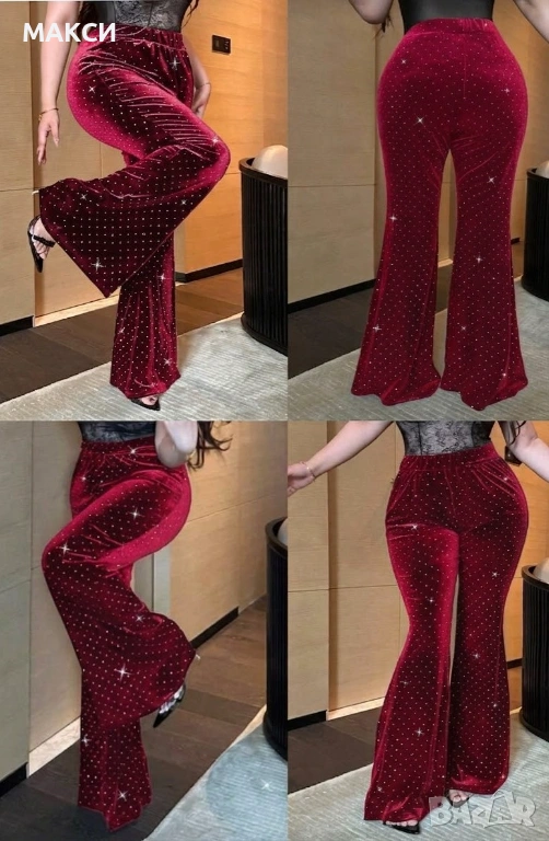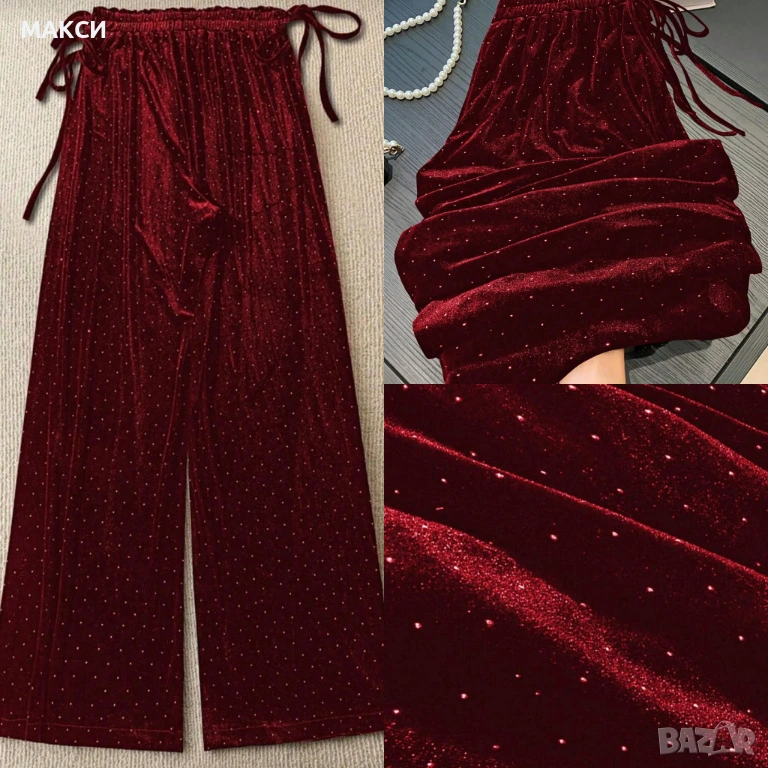 Макси празничен модерен силно еластичен клин-панталон Чарлстон в червено + декорация точки със сребристи кристали+ широка ластична висока талия+ странични връзки за пристягане