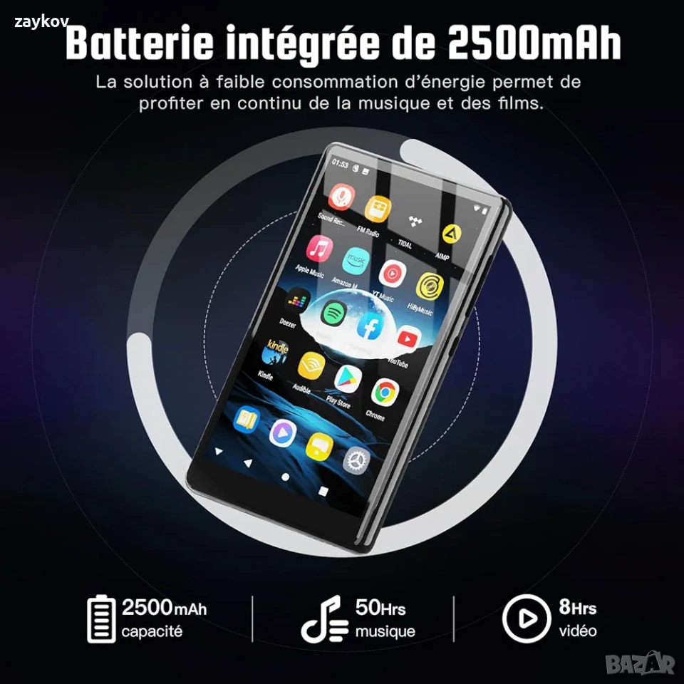 Музикален плейър за стрийминг --- Този музикален плейър е предварително зареден с най-популярните онлайн музикални приложения, включително Amazon Music, Spotify, Audible, Deezer, Kindle, YouTube, FM Radio и др. Съвместим е с повечето музикални формати MP3, WAV, APE, FLAC, AAC, OGG, WMA и др. Предлага различни категории песни, като заглавие, папка, изпълнител и албум.