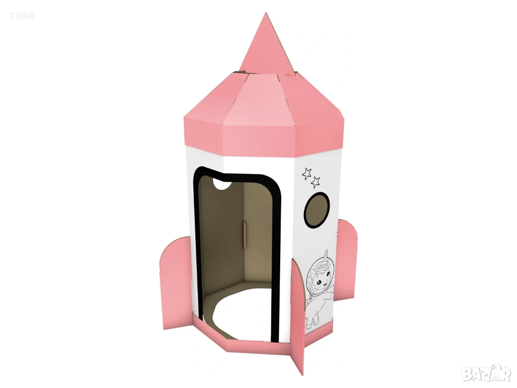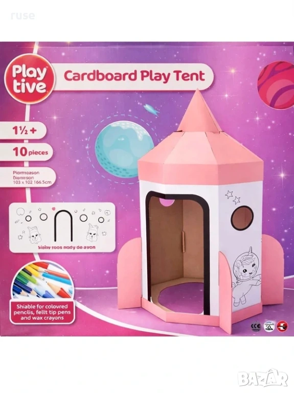 С очарователния си дизайн на ракета, тя кани децата да играят, оцветяват и да се крият. Палатката се състои от 10 здрави картонени части и е лесна за сглобяване от децата. Тя насърчава двигателните умения, креативността и въображението на вашето дете. Страхотно забавление за игра на закрито и на открито!