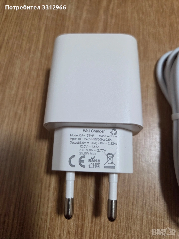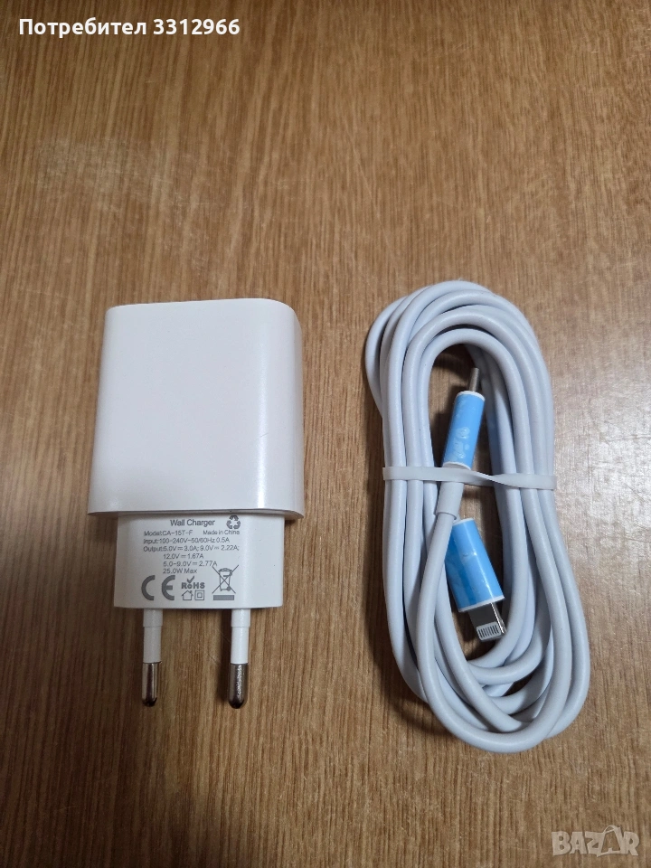 Чисто нов комплект за бързо зареждане, включващ стенен адаптер и USB-C към Lightning кабел, модел CA-15T-F. Максимална мощност: 25.0W. Входно напрежение: 100-240V ~ 50/60Hz, 0.5A. Изходна мощност: 5.0V=3.0A, 9.0V=2.22A, 12.0V=1.67A. Характеристики: Поддържа USB Power Delivery (PD) 3.0 за бързо зареждане и е оборудван със защити от прегряване и късо съединение.