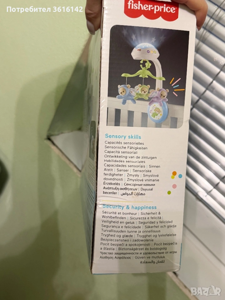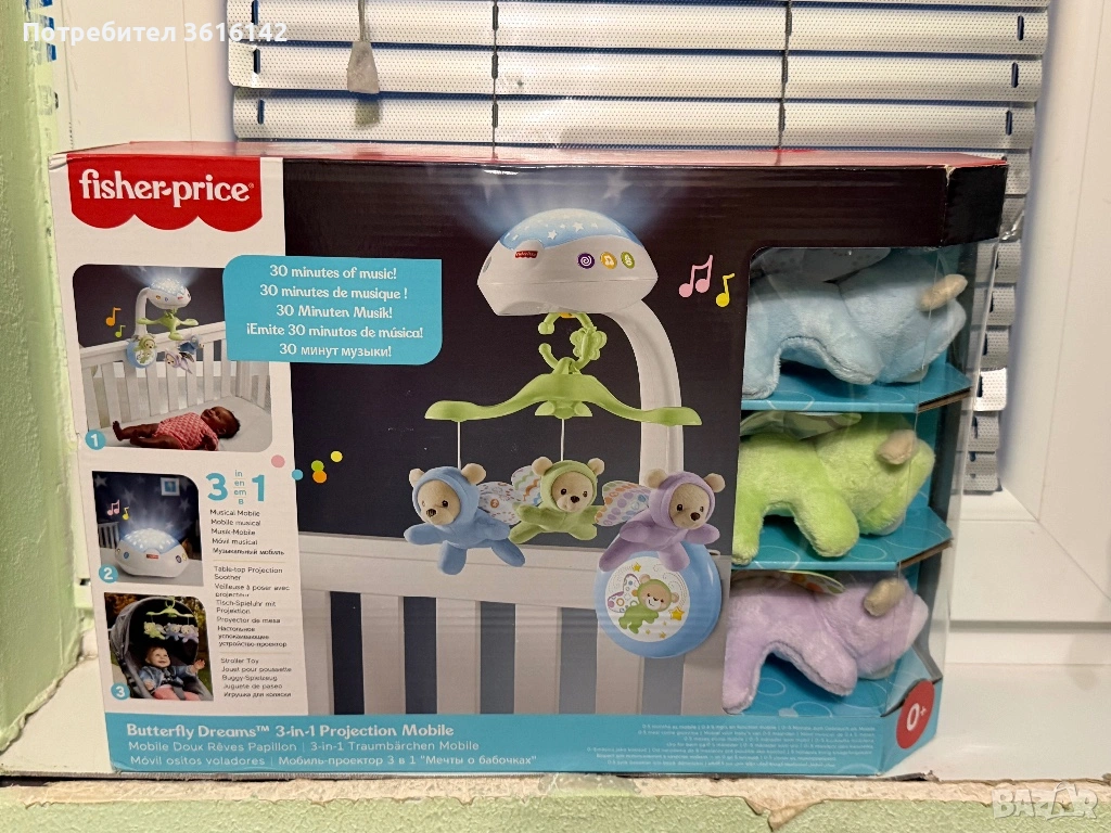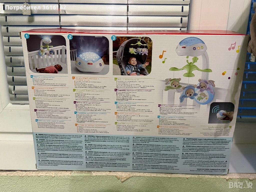 въртележка на "Fisher Price" ще съпътства вашето бебе в израстването. Красивите цветове, движения и звуци помагат на бебчето да развие своите сетива. Въртележката има проектор, който прожектира звездно небе и създава приятна атмосфера за сън и релакс. Когато детето порасне, проекторът може да се свали и да се използва, като нощна лампа за детската стая. Малките забавни животинчета танцуват пред очите на бебето под звуците на нежна успокоителна мелодия. Благодарение на подвижната халка може да ги прикрепите към детската количка. С дистанционното може да включвате или изключвате от разстояние функциите на въртележката, без да смущавате съня на вашето дете. То стартира 3 аудио режима с до 30 минути приспивна музика, бял шум или успокояващи звуци от природата.
