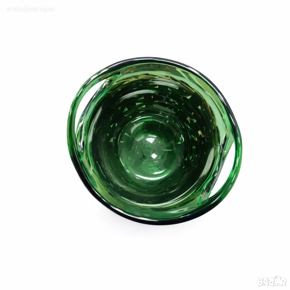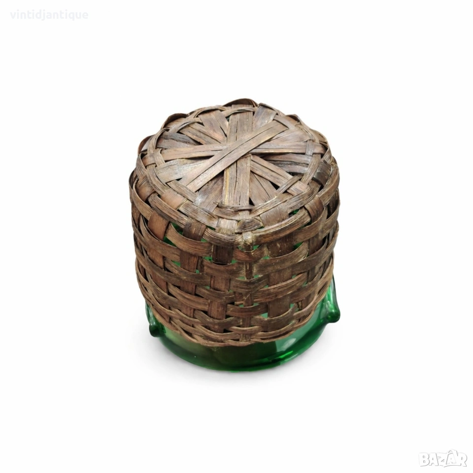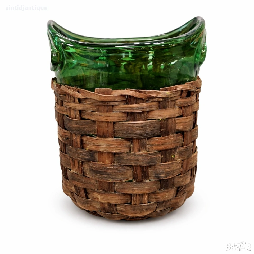 Винтидж ведро за лед (шампаниера), изработен от ръчно духано зелено стъкло с плетена основа.