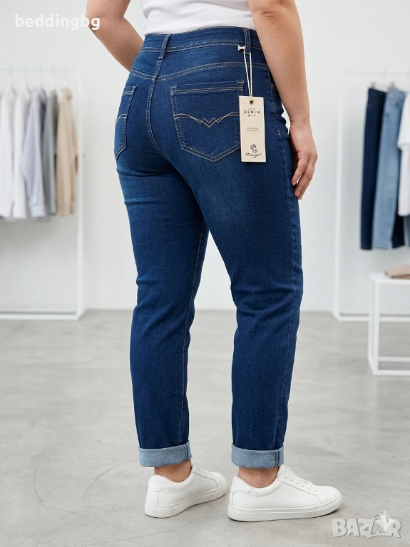 Дизайн: Класически пет джоба, красива бродерия на задните джобове и прав крачол, който може да се носи и навит.