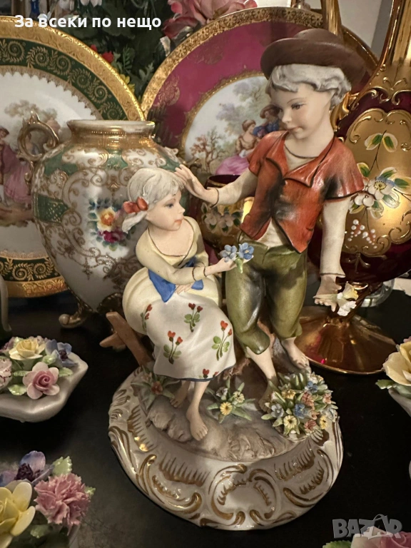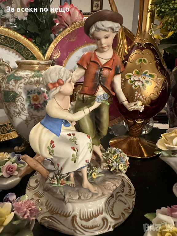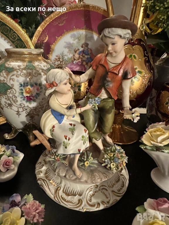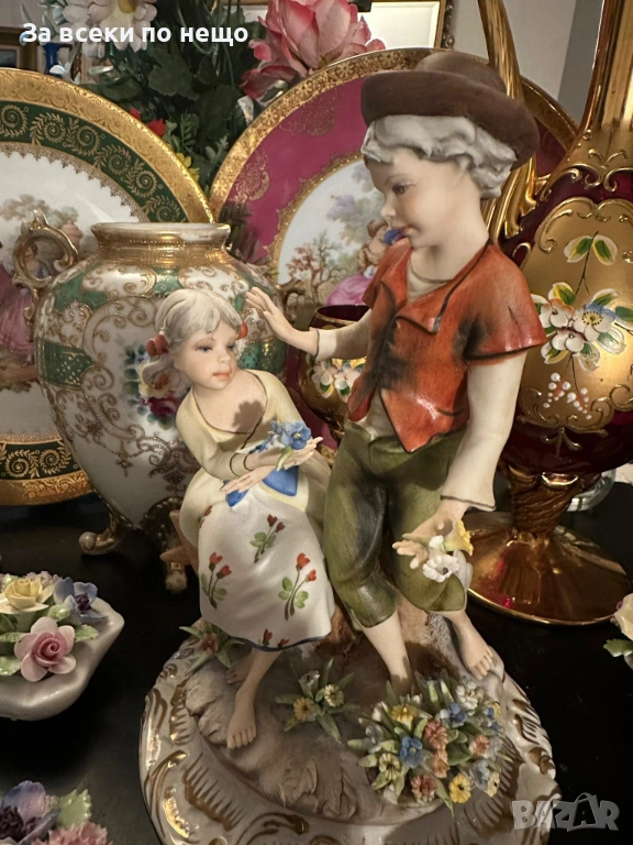 Capodimonte Italy , Romantic Couple “ Влюбените” прекрасна италианска композиция на двама влюбени и красиви млади, сътворена с много любовни великолепие, височина 23 см , наслада за възприятията, изпълнена с много майсторство от блестящ , порцелан и с изключително внимание на детайлите, отлично качество и състояние.
