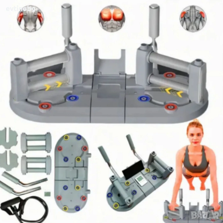 Технически характеристики: • 3-в-1: Plank / Push-up / Pull Rope • Anti-slip дръжки • Високо натоварване •