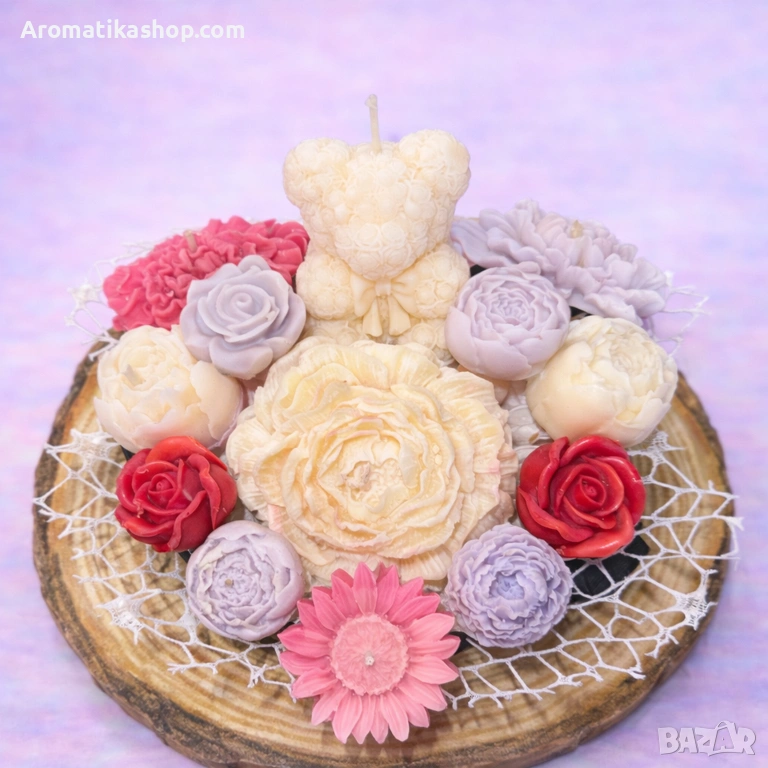 Мече от Нежност е ръчно изработен соев букет, който съчетава романтика, топлина и премиум излъчване. Аранжиран върху естествена дървена основа и обгърнат от нежна мрежеста декорация, букетът впечатлява с кремави, розови, червени и лавандулови рози, които създават балансирана и изключително стилна композиция. В центъра е разположено изящно мече от соев восък – символ на обич, грижа и искрен жест.