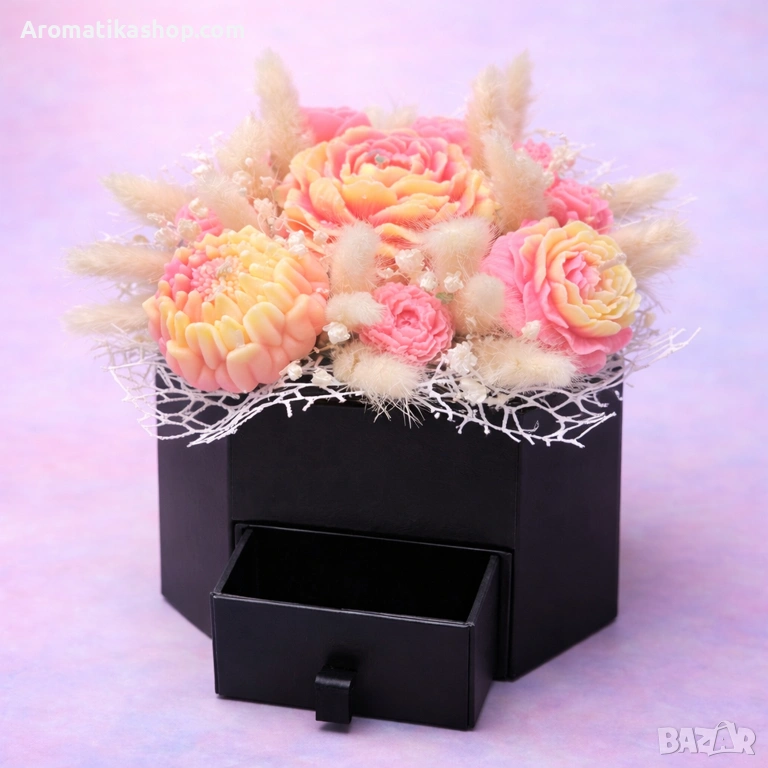 Кутията е с практично чекмедже, в което може да се постави бижу, пари, лично послание или малък подарък – превръщайки букета в двойна изненада. Това не е просто цветна композиция, а преживяване.