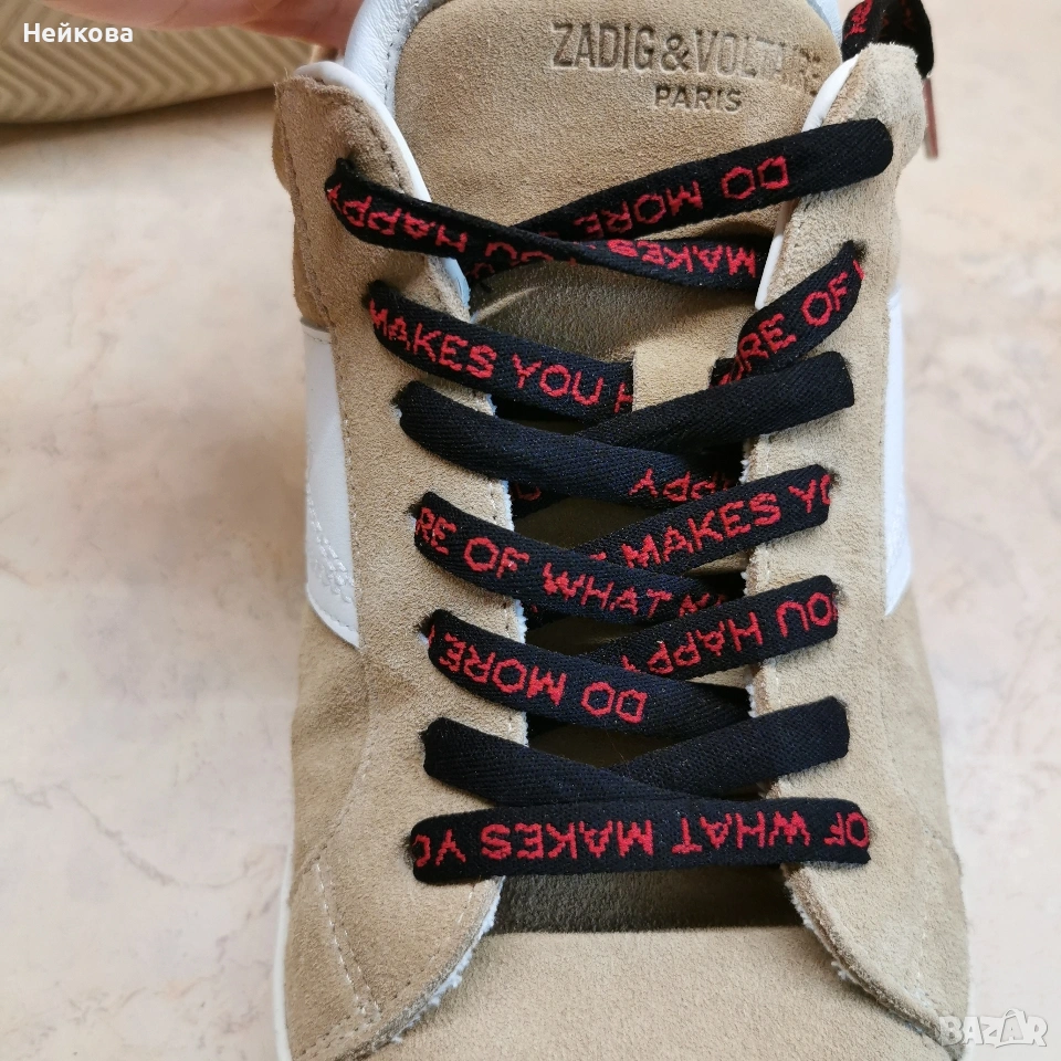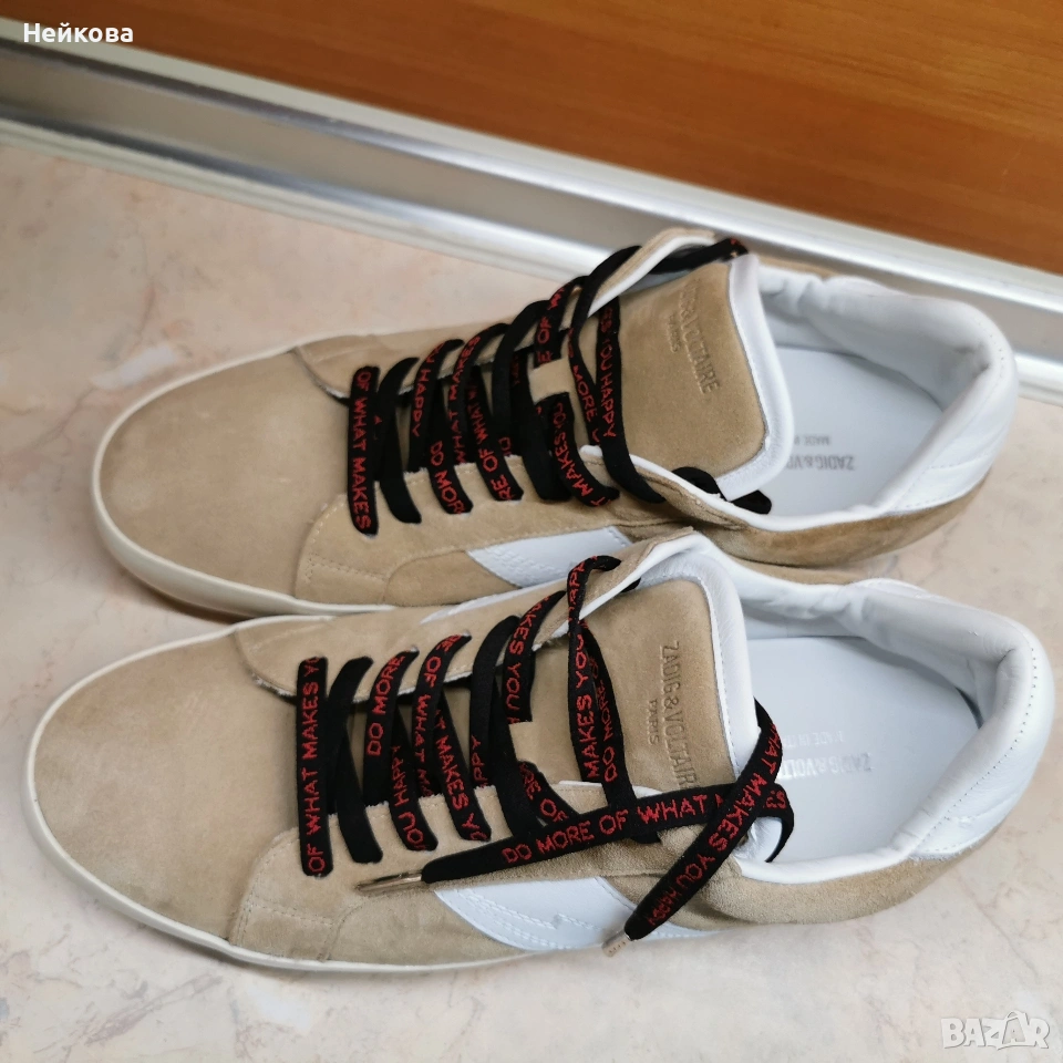 Този модел кецове е на марката Zadig & Voltaire. Обувките се отличават със специфичен дизайн, включващ велурена горна част в бежов цвят и характерна бяла емблема под формата на светкавица отстрани.