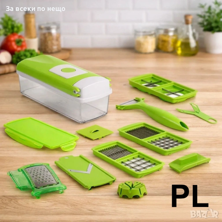 Практичен и универсален кухненски помощник, създаден да улесни рязането, настъргването и беленето на различни продукти. Комплектът разполага с няколко сменяеми приставки и остриета, които позволяват: