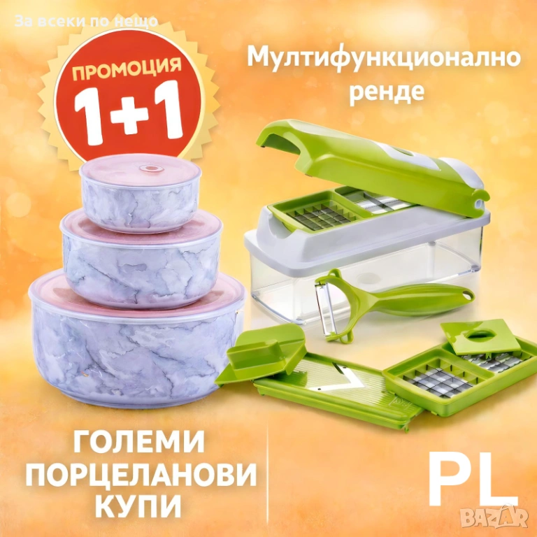 Възползвайте се от изгодна промоция 1+1, която комбинира два практични и незаменими кухненски артикула – многофункционално кухненско ренде Nicer Dicer Plus 10 в 1 и комплект от 3 големи порцеланови купи с капаци.