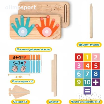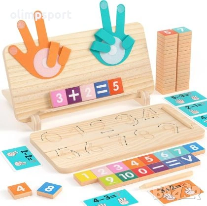 Дървена образователна играчка за броене с пръсти, включваща числови блокчета, обучителни карти