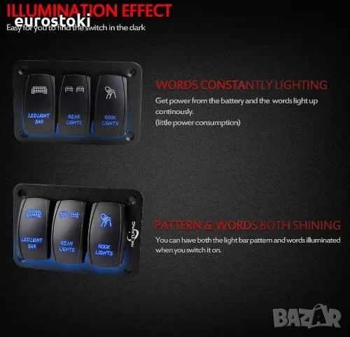 Широко приложение. Стандартен 5-пинов превключвател за 20 Amp/12 V и 10 Amp/24 V. Идеален за управление на LED панели, LED фарове, задни светлини, спомагателни светлини и др. Широко използван в автомобили, SUV, джипове, мотоциклети, ATV, UTV, лодки, яхти и други превозни средства.