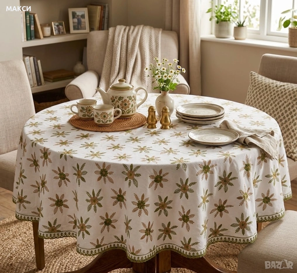 Разкошна памучна бяла покривка за кръгла маса с богата цветна красива бродерия и кант