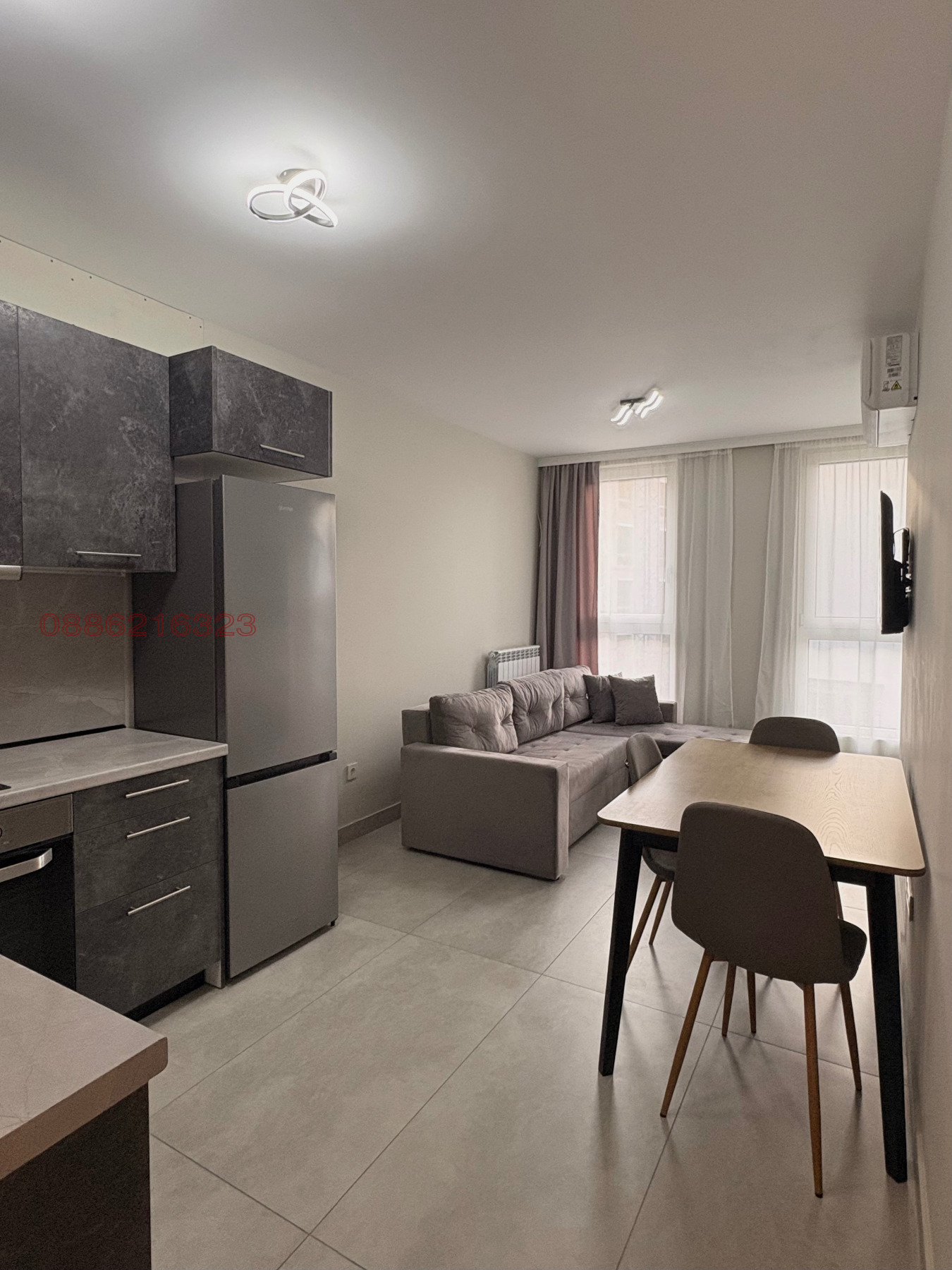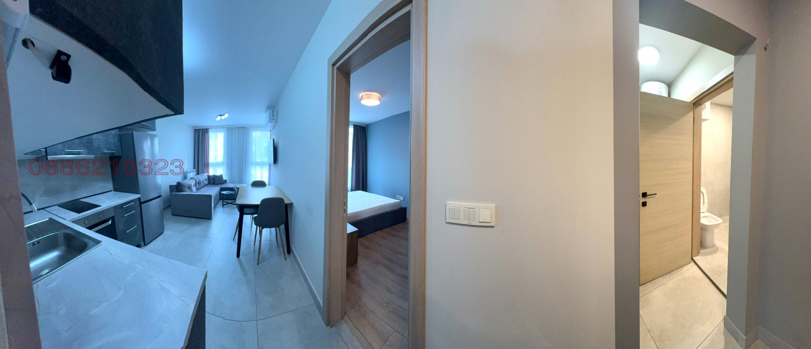 Апартаментът е напълно обзаведен с нови, качествени мебели и оборудван с всички необходими електроуреди телевизор, климатик, съдомиална и изцяло оборудвана кухня. Разпределението включва светла дневна с кухненски бокс, уютна спалня и модерна баня, с предверие в което се намира комбинирана пералня със сушилня.