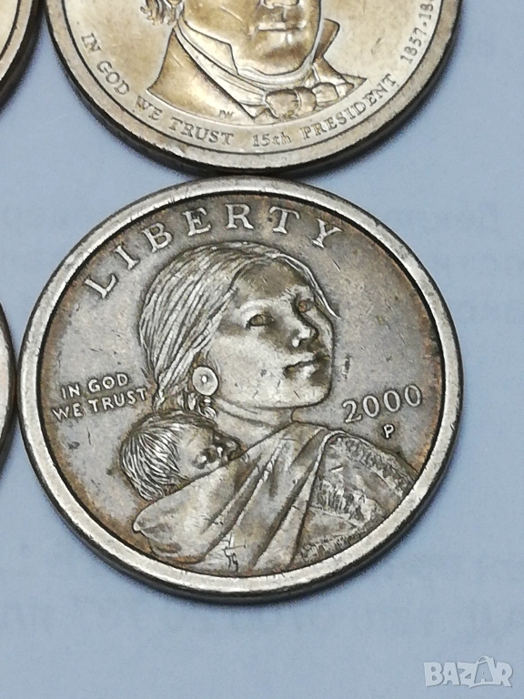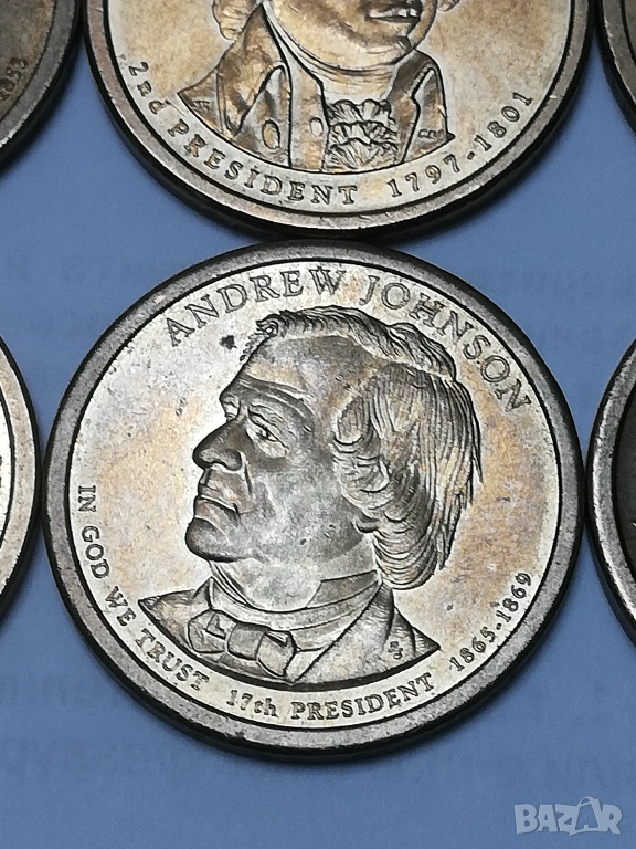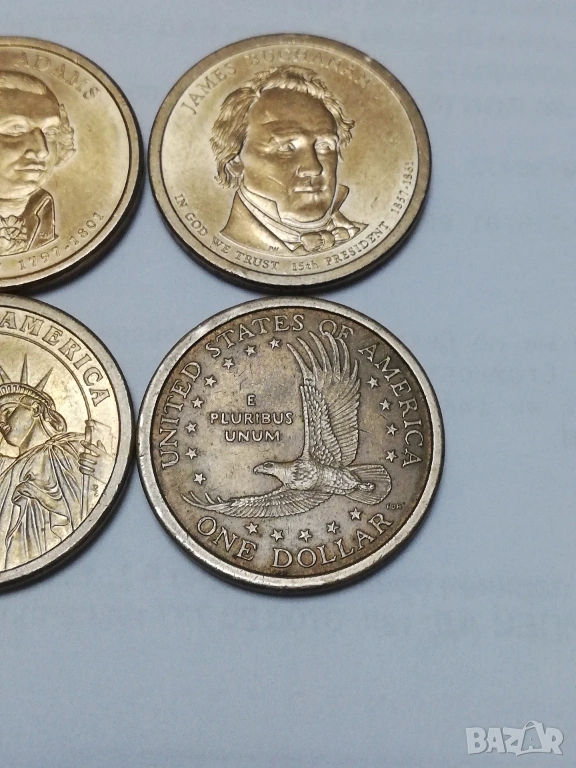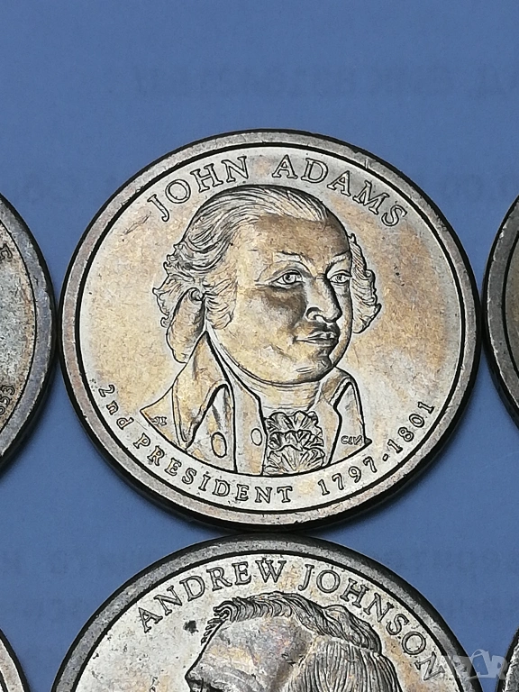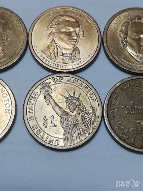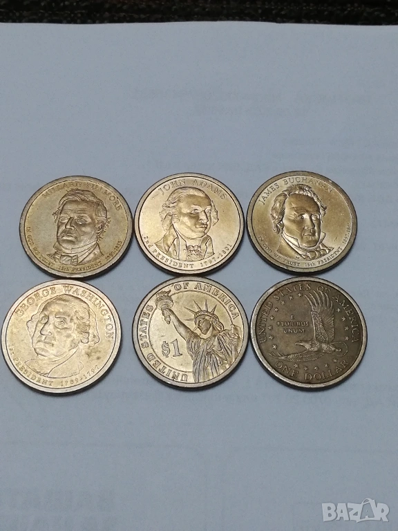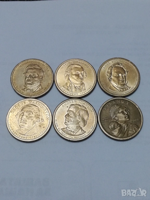 5 монети от 1 долар от поредицата президенти,налични,1-ви Джодж Вашингтон монетен двор D ;2-ри Джон Адамс монетен двор Р; 13-ти Millard Fillmors монетен двор Р; 15-ти James Buchanan монетен двор Р; 17-ти Andrew Johnson монетен двор Р.цена за брой 3,50 евро,изпращам само по еконт.