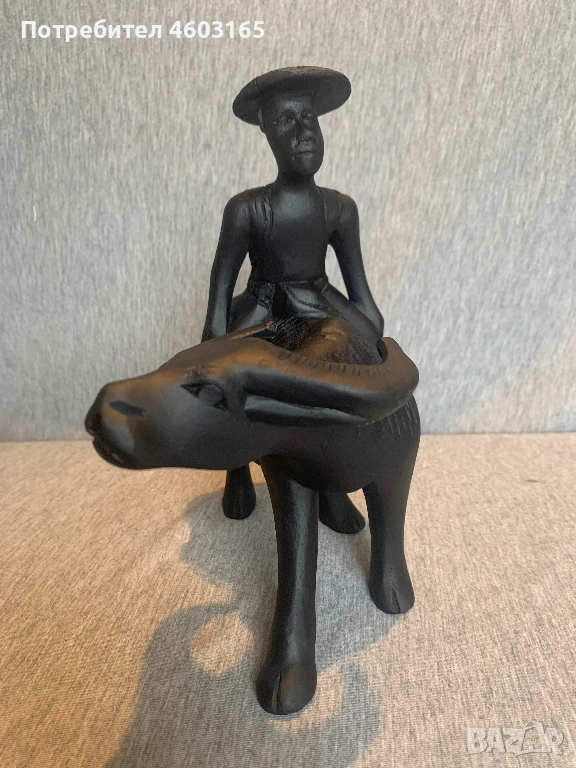 ръчно резбована дървена фигурка на азиатски мъж, яздещ бивол