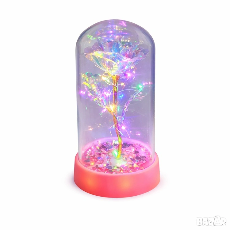 Елегантна кристална роза в стъклен купол с LED светлини, които придават меко и красиво осветление. Перфектна за декорация у дома или като подарък.