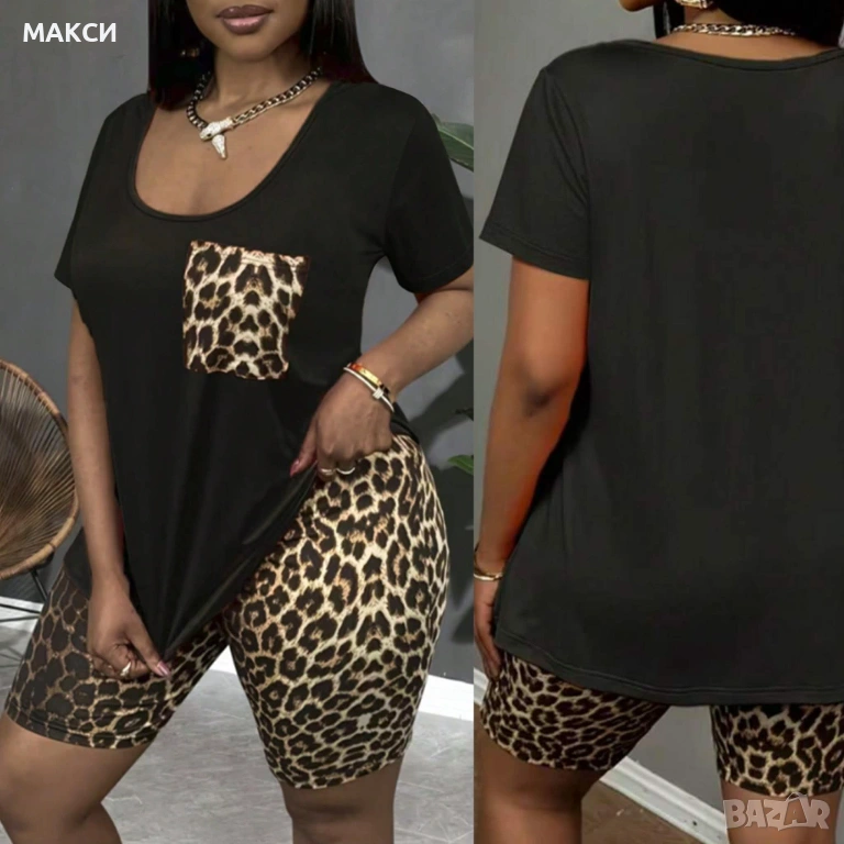 Макси чудесен силно еластичен и мек комплект - тениска с джоб в черно + 3/4 клин с ластична висока талия в леопардов десен