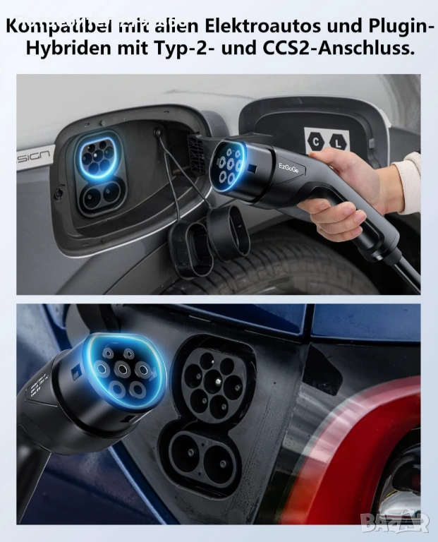 - Лесна употреба и съвместимост: зарядното за кола е съвместимо с всички BEV/PHEV превозни средства с контакт за зареждане тип 2 (IEC 62196-2). Просто го включете в съществуващ CEE контакт - не е необходим монтаж. С кабела за зареждане cee 16a към тип 2 получавате мощност на зареждане до 11 kW. Мобилната зарядна станция 11 kW е готова за употреба и ви спестява време и усилия.