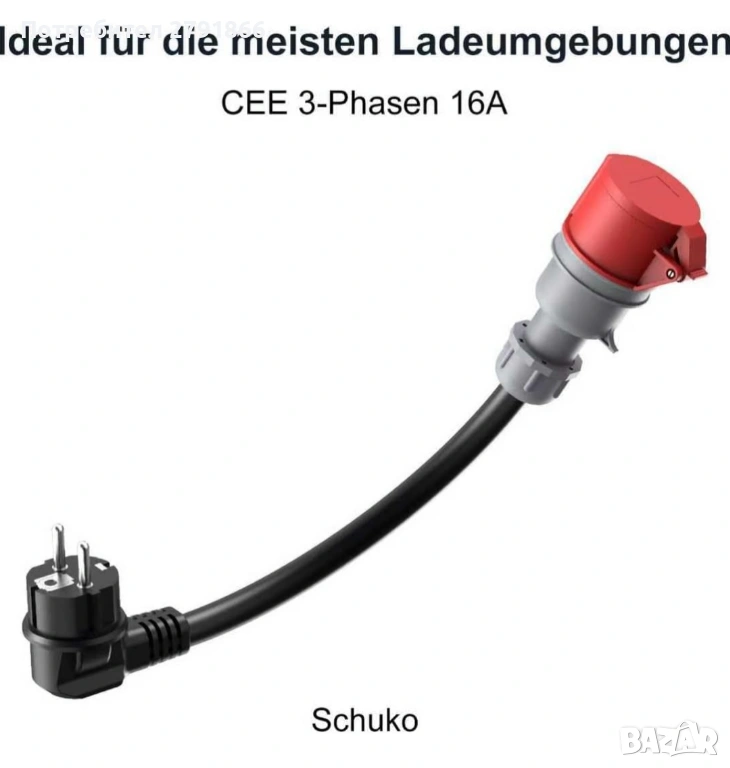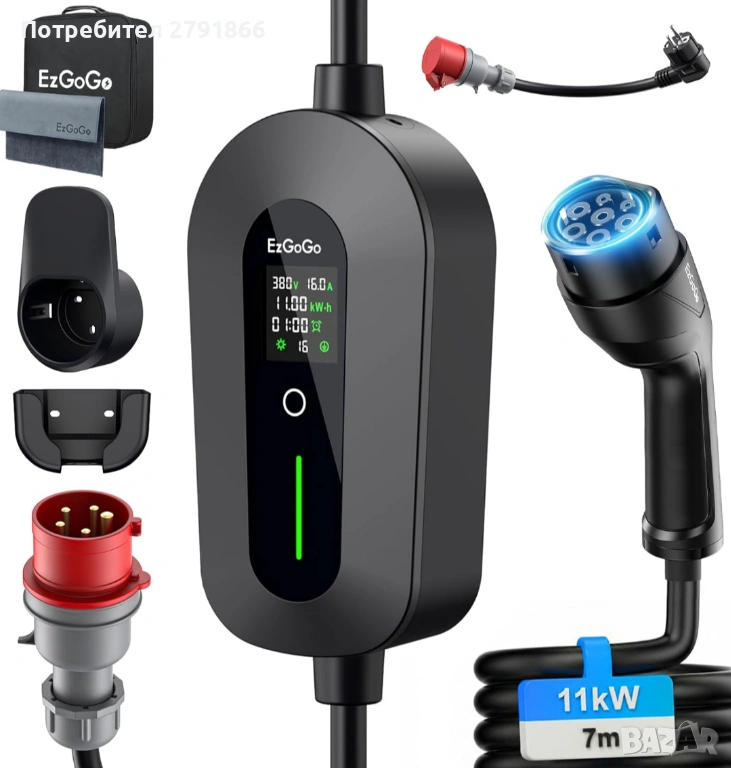 Мобилна зарядна станция EV Wallbox 11kW тип2 3-фазна 7м кабел CEE16A към тип2 + адаптер за монофазно