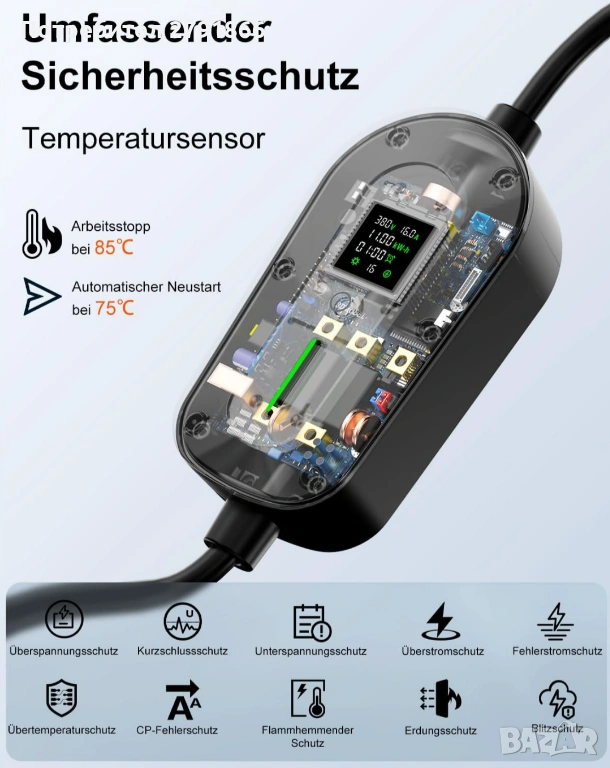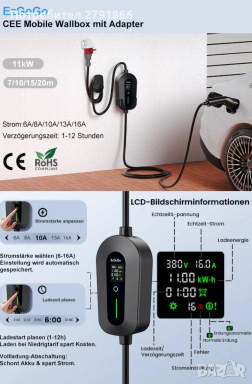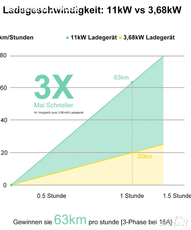 - 3 пъти по-бързо зареждане: в сравнение със стандартния домашен Schuko контакт (230 V x 16 A), тази 11 kW стенна кутия зарежда до 3 пъти по-бързо с трифазен CEE 16A контакт (230 V x 16 A x 3). Тя постига зарядна мощност от 11 kW на час и спестява до 13 часа време за зареждане в сравнение с Schuko контакта. Ясният LCD дисплей показва състоянието на зареждане, а функцията таймер (1-12 часа) позволява зареждане при ниски тарифи, за да се намалят разходите. Автоматичното изключване предпазва батерията.