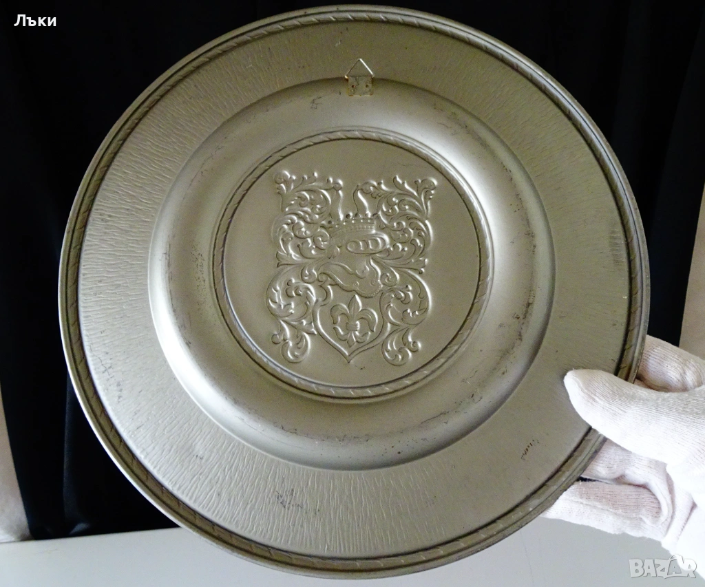 е декорирана с нежен кован релеф.Има стабилна окачалка за стена.Чинията е