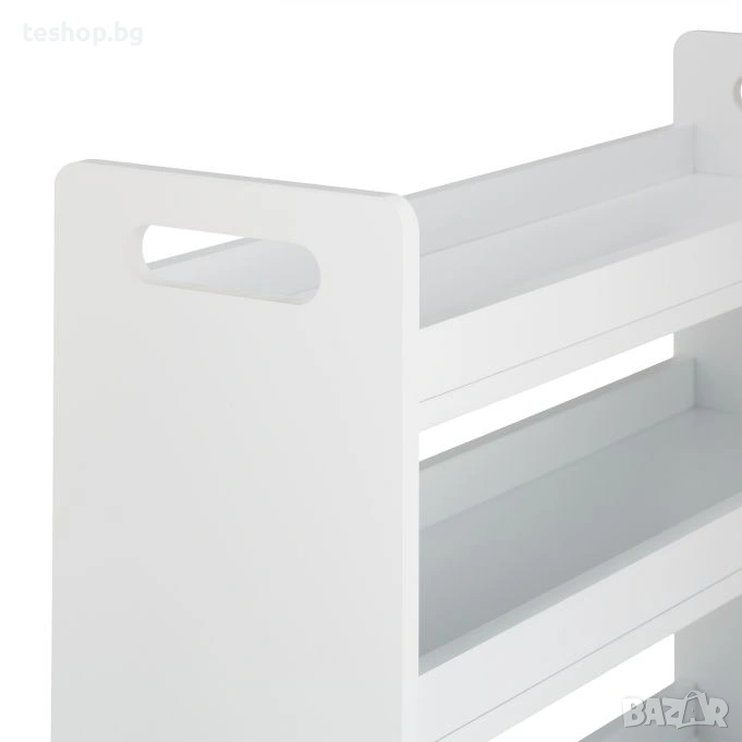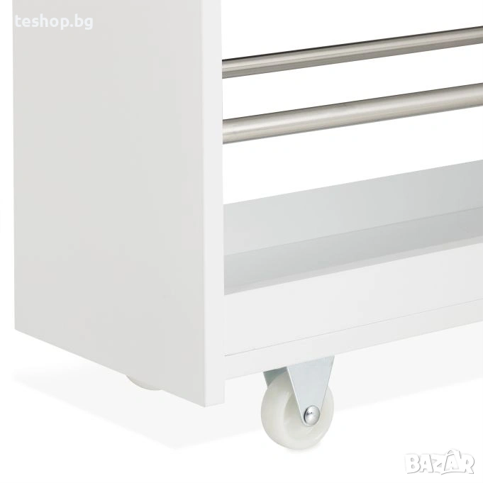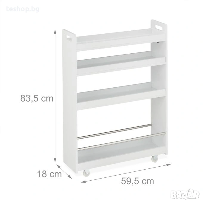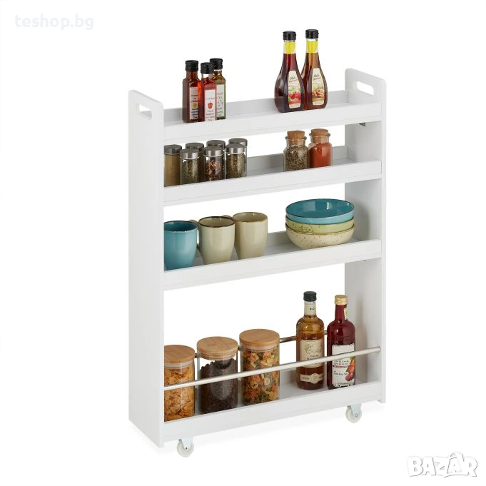 Количка за съхранение на принадлежности за баня или друго Relaxdays Количката на колелца е перфектната мебел за банята или кухнята, която създава практично пространство за съхранение дори в тесни ниши и ъгли. С 4 рафта, тясната етажерка предлага достатъчно място за козметика, почистващи препарати, подправки, консумативи и други принадлежности за баня или кухня. Благодарение на отворения дизайн и 4-те колелца, количката може лесно да се мести напред-назад, а съхраняваните прибори са винаги под ръка.