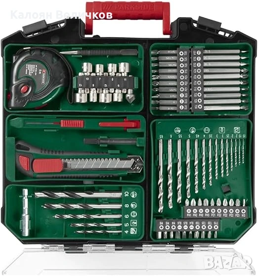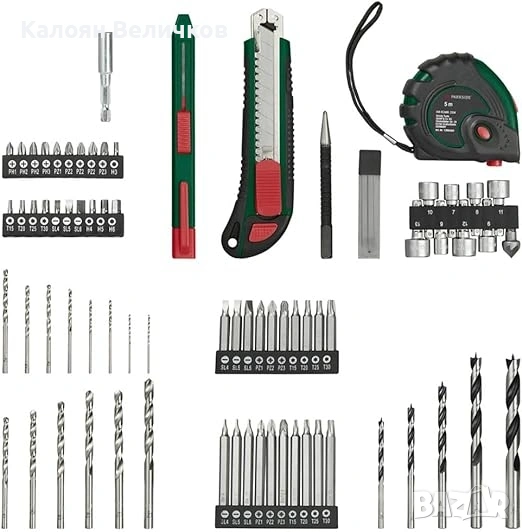 Комплект от 73 принадлежности: 1 макетен нож, 1 дърводелски молив (вкл. 2резервни елемента), 1 рулетка , 8 глухи ключа, 1 зенкер,1център, 5 свредла (бургии) за дърво, 14 свредла за метал, 40 бита, 1 магнитен държач за битове.