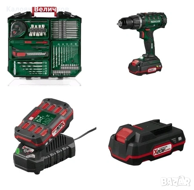 Пълен комплект бормашина, включва 2 акумулатора(батерии) 1 зарядно устройство и множество принадлежности