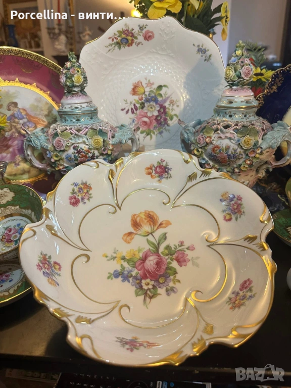 Germany Circa 1964 Super Beauty from Jlmenau - автор и художник Graf Kenneberg Handpainted Floral Gold Edge Plate - ръчно нарисувана купа (плато) с невероятна красота на централен букет и шест малки цветни сектора обилно декорирани със злато и класа, великолепна визия, немско качество и чар, диаметър Ф 24 см, дълбочина h 7 см, невероятен блясък, ослепителна представителност, определено център на внимание за всяка мебел или витрина, отлично качество и състояние.