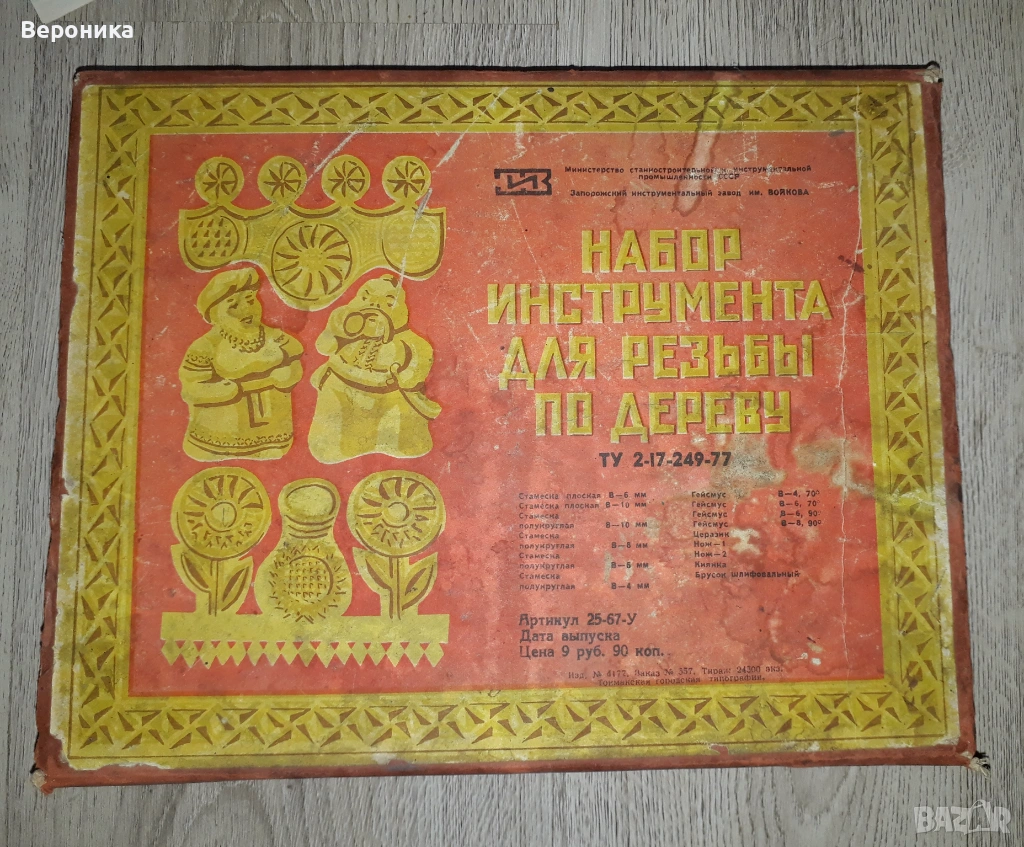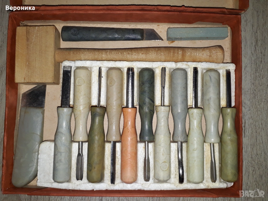 Комплект инструменти за дърворезба, произведен в СССР. Използван за много кратко, забележка по кутията.