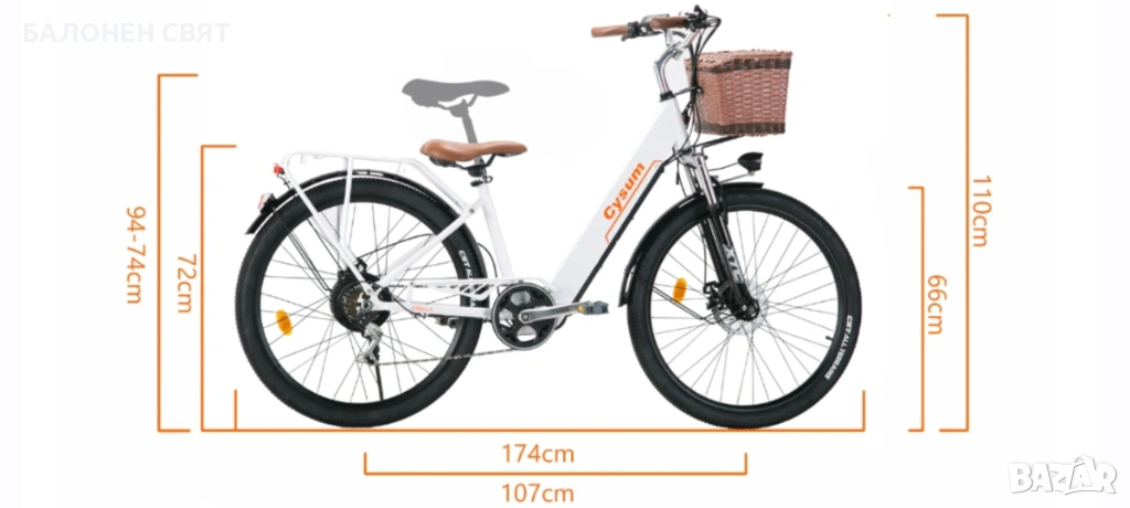 еБайк НОВ Електрически Велосипед Cysum Cityrun за възрастни 250W 36V 10Ah 26” гуми