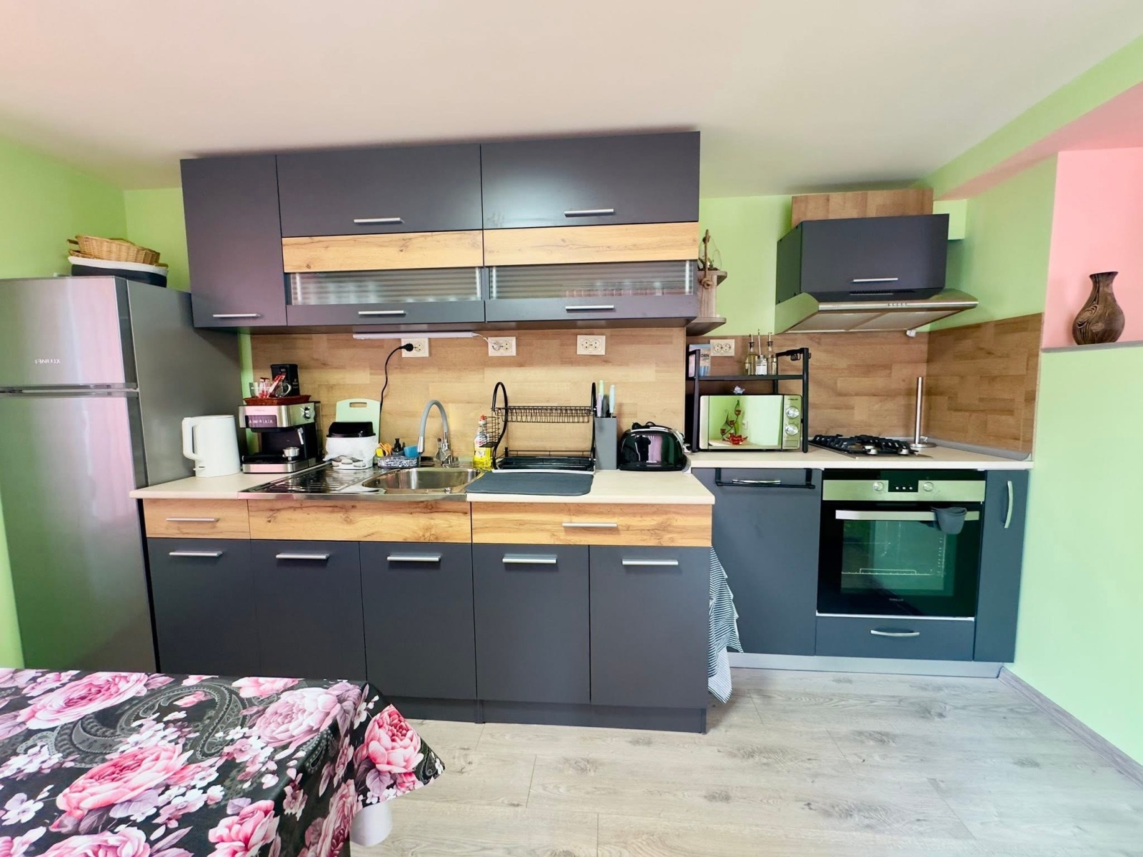 Първи етаж: Просторна трапезария и модерна кухня (оборудвана с печка, фурна на газ, хладилник, микровълнова). За комфорта се грижат 2 бани и мощна камина Prity (29 kW) с водна риза, радиатори в цялата къща и подсигурен UPS.