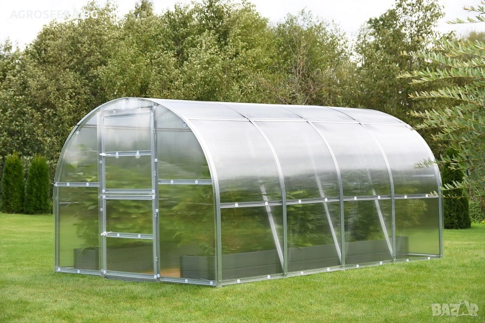 Оранжерия AGROPRO , проектирана адаптивна към нуждите на всеки клиент. Просторната оранжерия ще ви позволи да използвате добре цялата ѝ площ. Светлината и топлината се разпределят равномерно в оранжерията, което ускорява растежа на растенията, което води до наистина голяма и изобилна реколта. 1 мм дебелите омега-образни профили, използвани за конструкцията на оранжерията, са изработени от ленти с ширина 78 мм. Сглобяват се с винтове M5. На всяка арка има подсилващи профили. Клетъчният поликарбонат на оранжерията с дебелина 4 мм гарантира дълготрайността на оранжерията и отличните топлоизолационни свойства. Поликарбонатът е силно устойчив на удари и градушка. Благодарение на прозрачността на поликарбоната (приблизително 85% прозрачност), той осигурява отлична слънчева светлина на растенията, а благодарение на UV стабилизаторите, предпазва растенията от опасностите от пряката слънчева светлина.