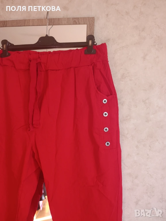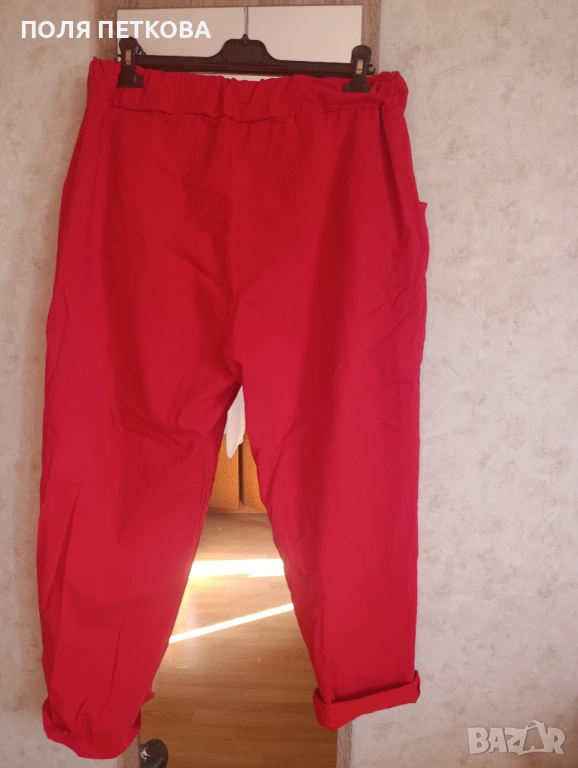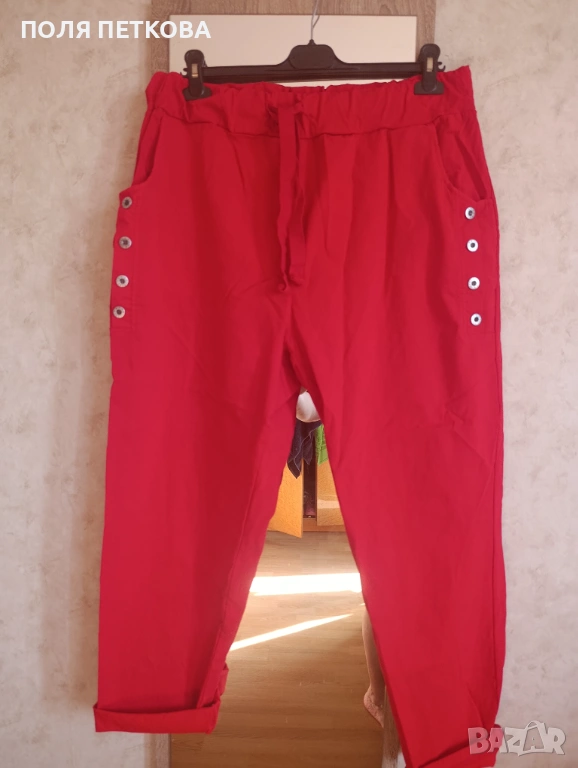 Нов италиански червен панталон широк свободен модел много еластична материя става за размер XL 2.3xl талия на ластик и с връзки от 84 до 120 см ханш130 с еластичност до 155 см цяла дължина 100 см изключително леки и удобен