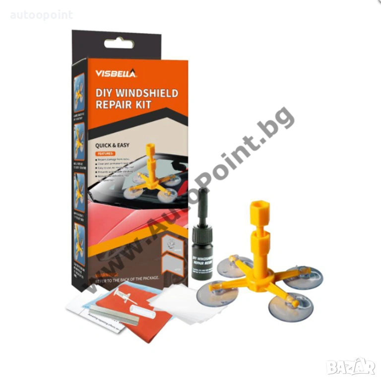 Ремонтният комплект Visbella® Windshield е много лесен за използване, той ще ви помогне да поправите пукнатината в предно стъкло само за 20 минути. Този комплект ще сведе до минимум видимостта на пукнатините и ще спре разпространението им в предното стъкло. Премахвайки въздуха от мястото на счупване го запълва с трайна смола и го прави още по-здраво от преди. За най-добри резултати ремонтът трябва да се извърши колкото е възможно по-скоро след поражението и преди мястото на спукване да е замърсено с мръсотия или вода.
