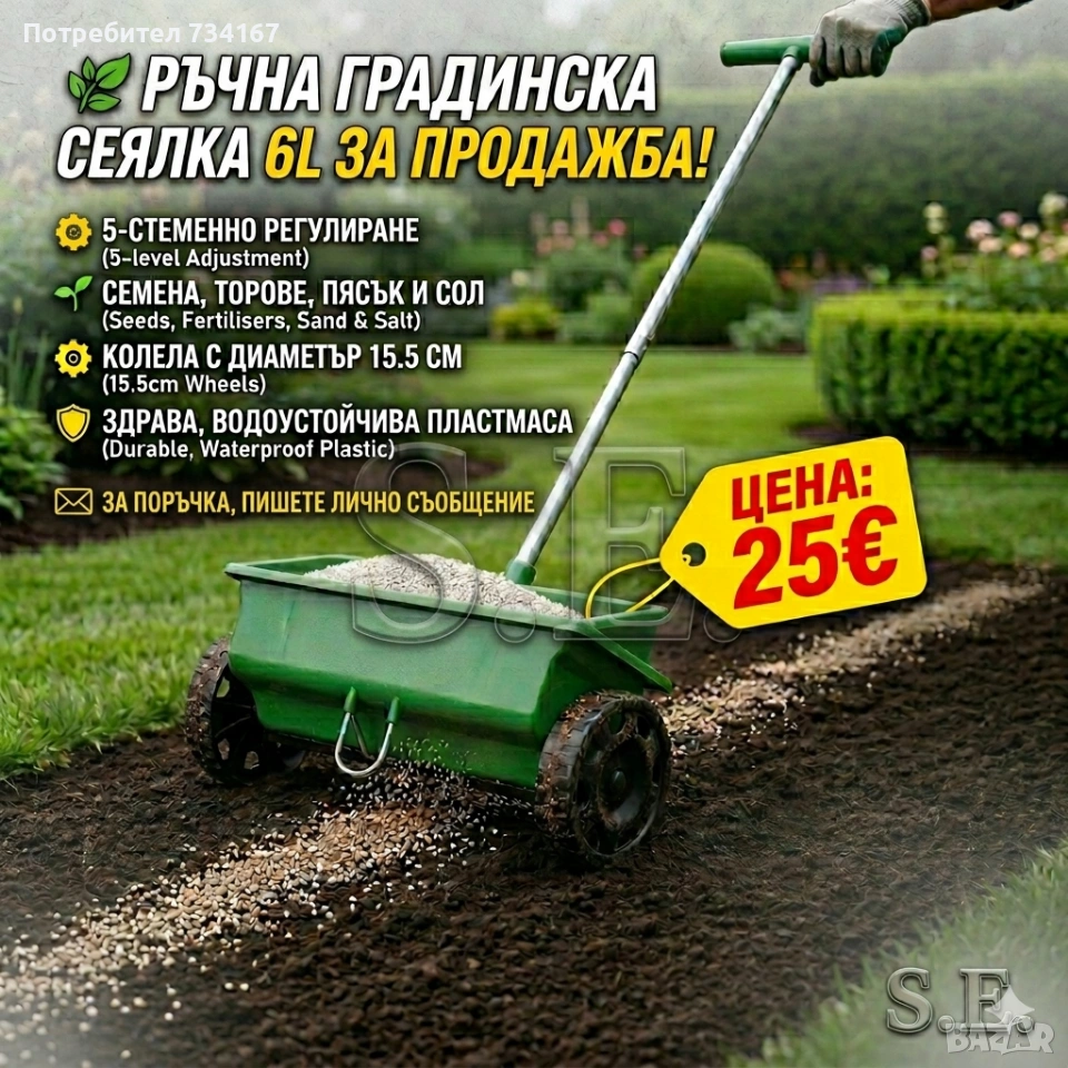 Продавам чисто нова, практична и лека ръчна сеялка, идеална за поддръжка на двора и градината през цялата година. С нея разпръскването на семена или торове става бързо, равномерно и без излишни усилия!