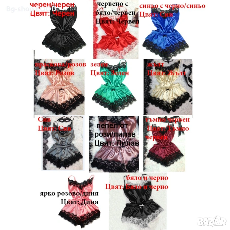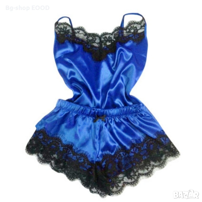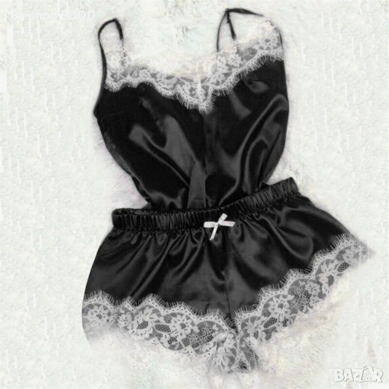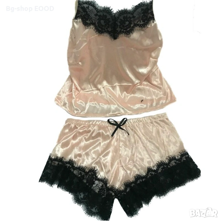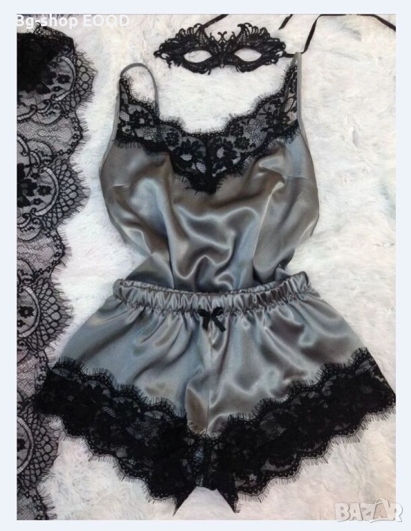 Комплектът включва: топ, къси панталонки и сатениран аксесоар.