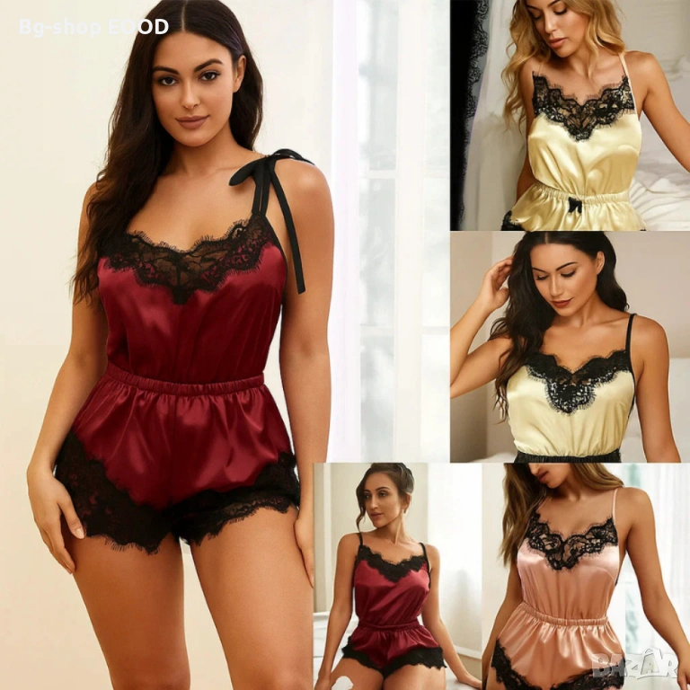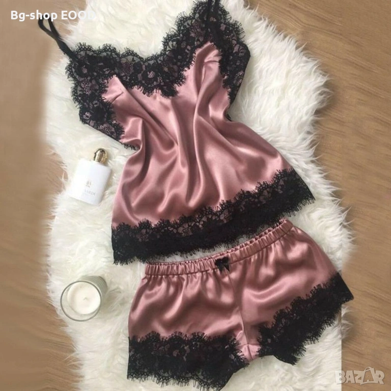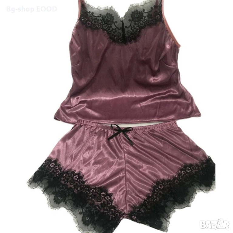 Продава се елегантна дамска пижама от две части – топ и къси панталонки, допълнена със стилен сатениран аксесоар. Лека, удобна и приятна на допир материя, подходяща както за сън, така и за домашен комфорт.