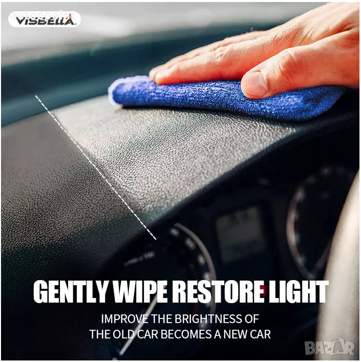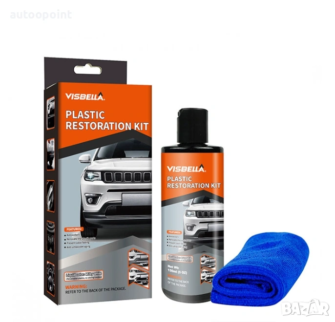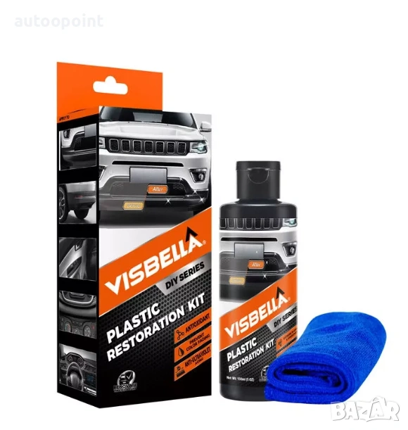 - Продуктът Visbella® Plastic & Trim Restoration kit има добра смазка, може да предотврати стареене на повърхността, може и ефективно да възстанови първоначалния блясък на пластмасовите и гумени части като бронята, лайсната на вратата и арматурното табло.