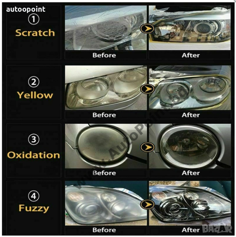 - ВАЖНО: Полирането и почистването на фаровете да не е на пряка слънчева светлина.