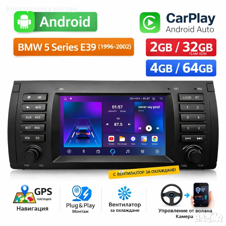 bmw e39, мултимедия bmw e39, android мултимедия bmw, carplay bmw e39, навигация bmw e39, bmw e39 1999, bmw e39 2001, android auto bmw, 7 инча мултимедия, радио bmw 5 серия