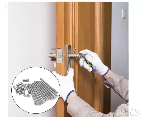 Просто пробийте отвор през крилото на вратата, поставете дръжката на вратата върху вратата, така че да съвпадне с пробития отвор, и натиснете винта през дръжката на вратата, поставете крилото на вратата към дръжката от другата страна, прикрепете втулката и я затегнете.