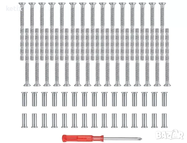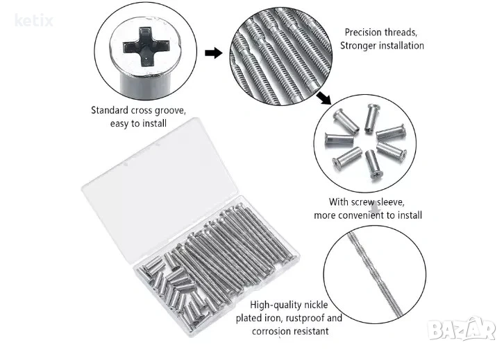 Мебелните винтове и втулки M4 са изработени от никелиран, изключителен материал с висококачествено покритие, който е силно стабилен на въздух и устойчив на корозия, твърдостта е сравнително висока, има отлични полиращи характеристики, издръжливи за дълготрайна употреба.