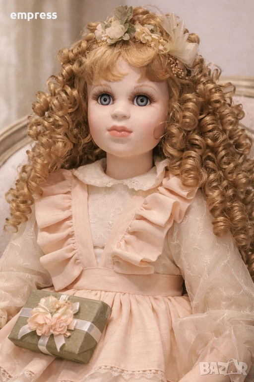 Куклата впечатлява с невероятно нежно и реалистично излъчване. Лицето е изработено от фин порцелан с деликатно изрисувани черти, изразителни сини очи и меки розови устни, които придават живо и очарователно изражение.