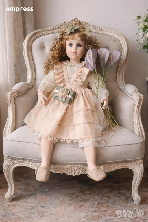 Куклата е облечена в изключително изискан винтидж стил рокля в нежни прасковени тонове, изработена от качествени материи с фина дантела и декоративни волани. Детайлите по роклята са много внимателно изпълнени – от дантелените ръкави до декоративната панделка и малката подаръчна кутийка. В ръката си държи красив букет от елегантни цветя, който допълва цялостната композиция.