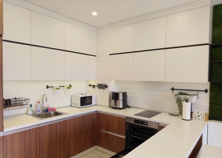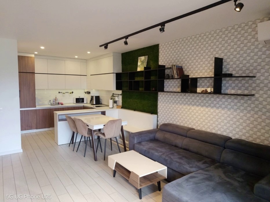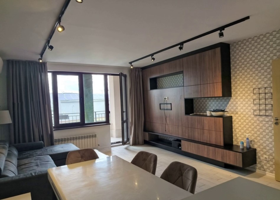 Имотът е обзаведен, с площ 115 кв.м, на 2-ри етаж от 4 етажна сграда с асансьор. Разпределението включва входно антре, просторна дневна с кухня и трапезария, две спални, две бани с тоалетна и тераса.