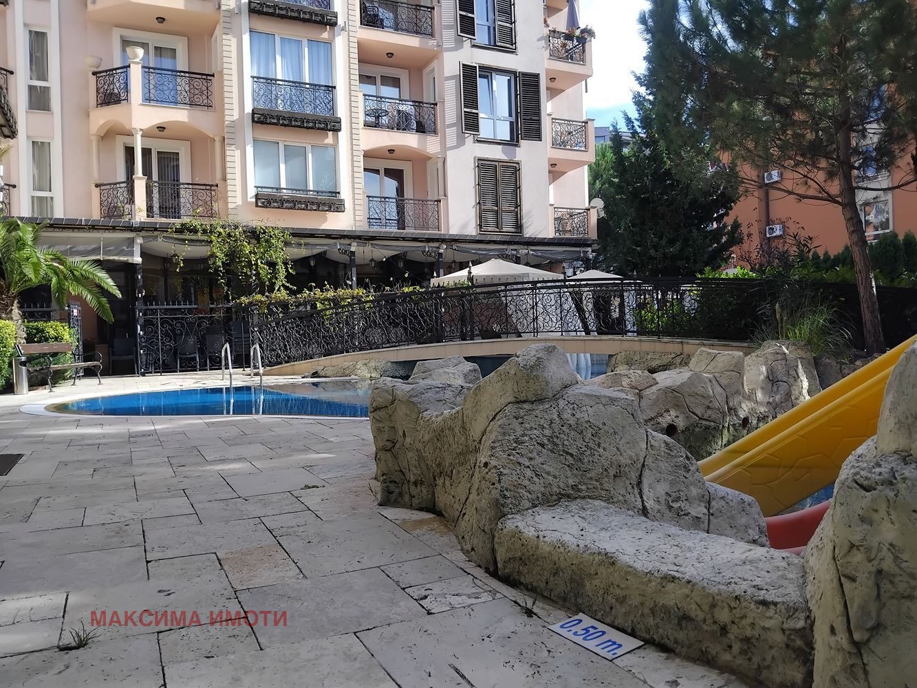 Комплексът впечатлява с луксозна атмосфера и отлично поддържани общи части богато озеленена територия, елегантен басейн със сепарета за отдих, шезлонги и чадъри, които създават усещане за комфорт и релакс, сравним с хотел от висок клас. Такса поддръжка - 12,5 /кв.м за година.